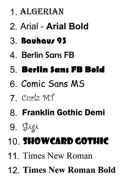 Los siguientes, son catálogos de fuentes que se pueden elegir para los nombres en las comisiones.